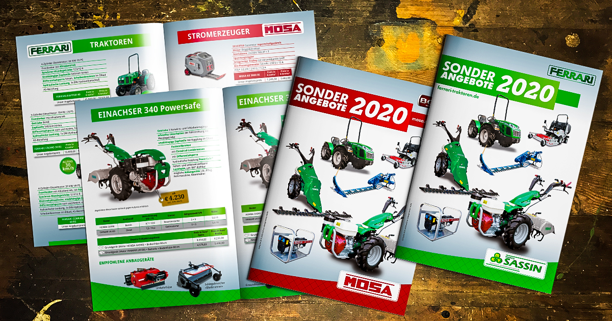 Seit 2013 gibt »MKV Sassin | Ferrari Traktoren« jährlich im Frühjahr einen Angebotsprospekt heraus. Früher war dieser unter dem Namen »PRIMAVERA Frühjahrsbote« bekannt. In diesem Jahr wird der Sonderangeboteprospekt erstmals als Gemeinschaftsprojekt von »MKV Sassin | Ferrari Traktoren« und »MOSA Deutschland« veröffentlicht.